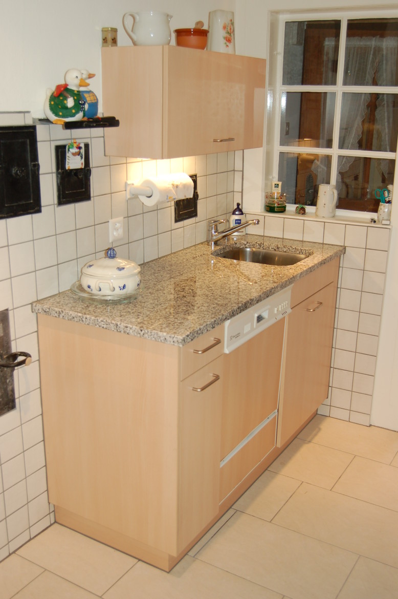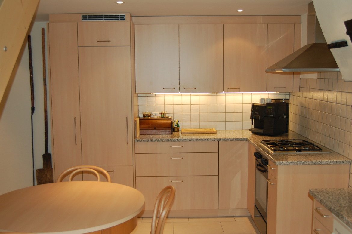 Küche in L-Form in hellem Buchen-Dekor mit klassischem Gasherd unter einer Abzugshaube aus Edelstahl passt sich optimal dem Altbau an.