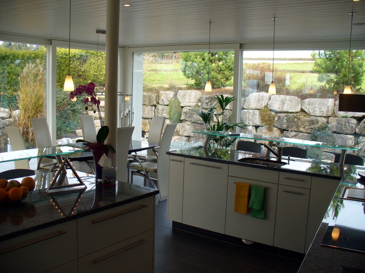 Designküche für ein Einfamilienhaus mit freistehendem Arbeitsbereich in dunklem Granit, Chromstahl und grünem Glas.