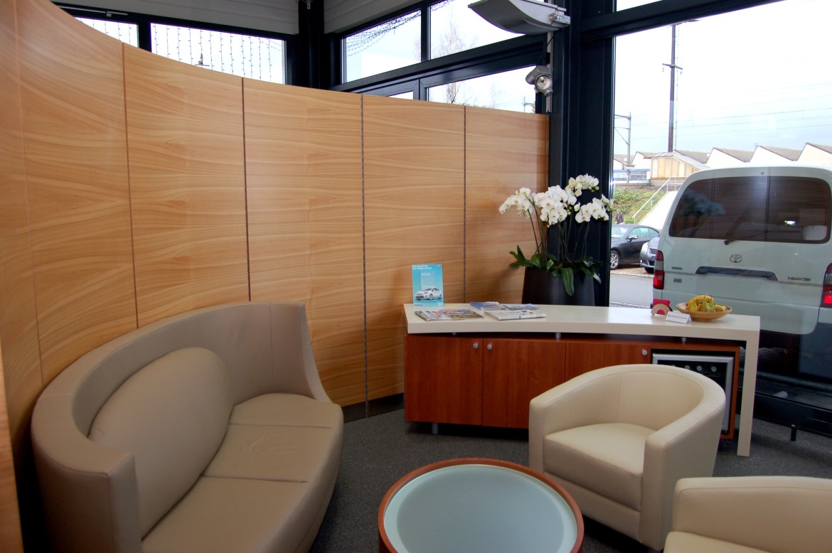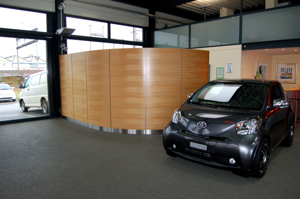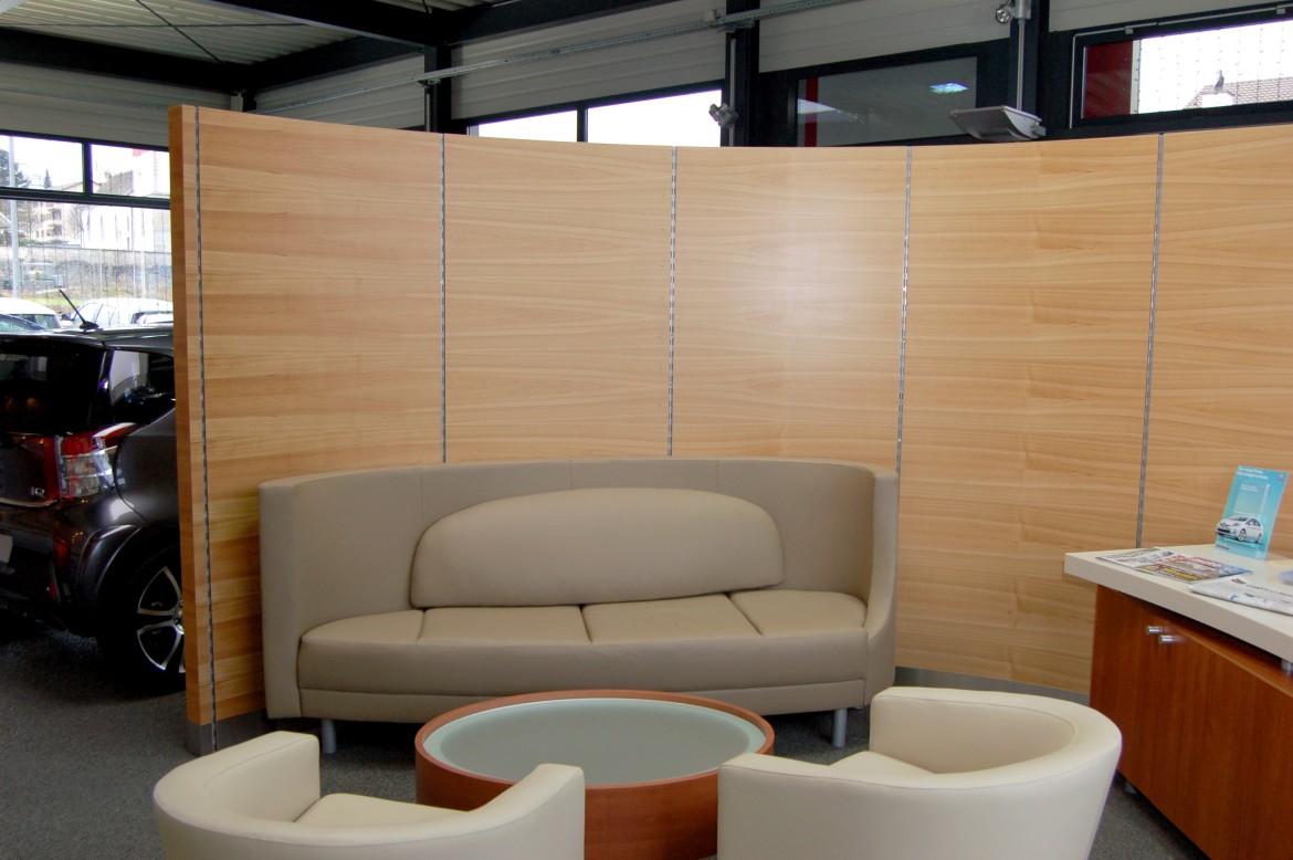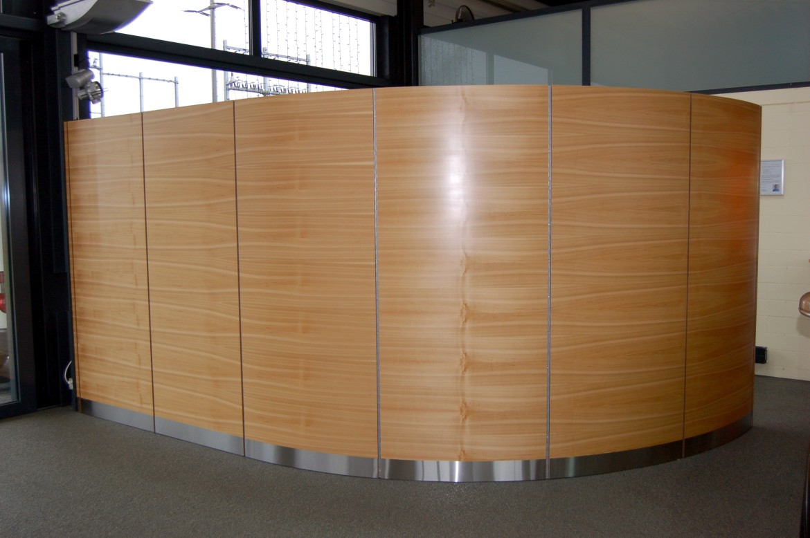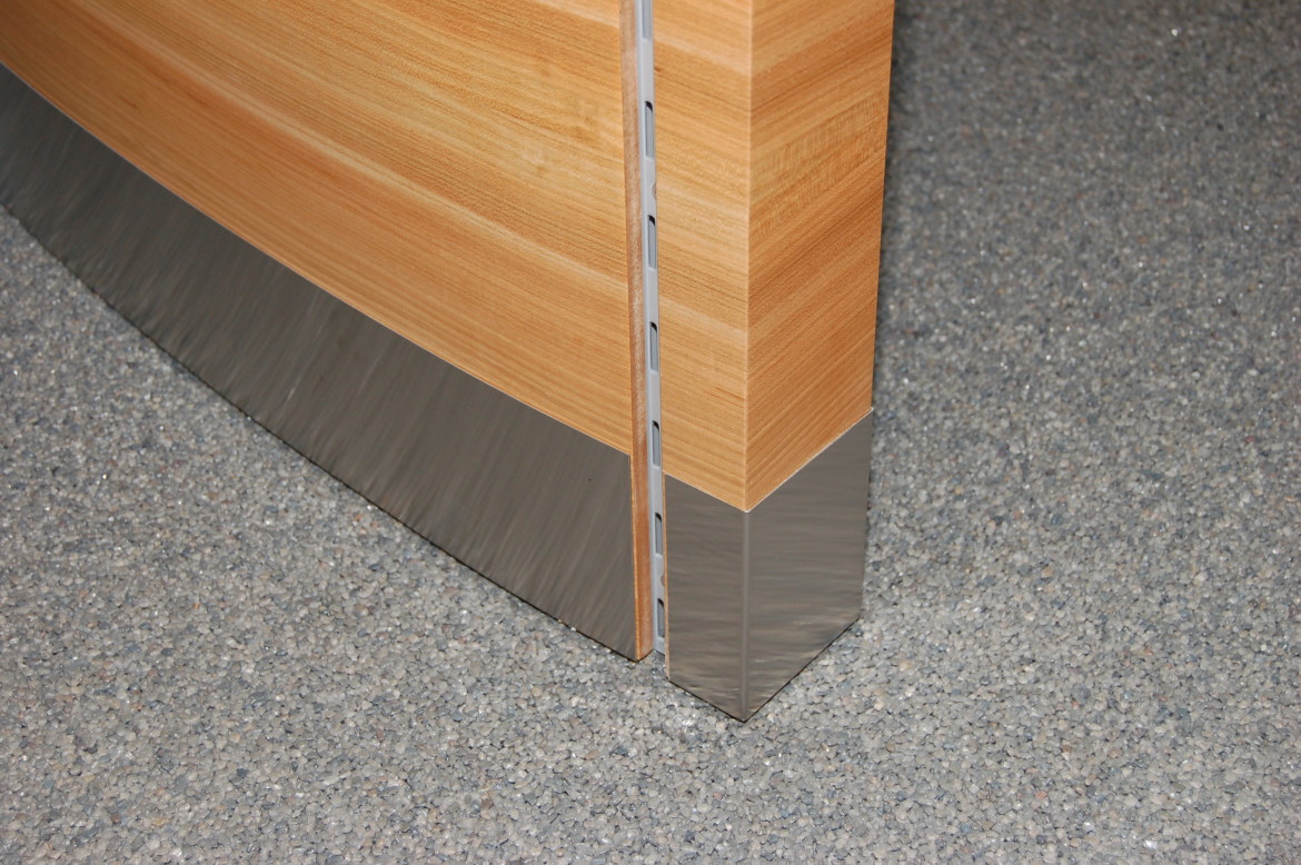 Gebogene Trennwand in Kirschbaum furniert mit Stellschienen zwischen den einzelnen Elementen.