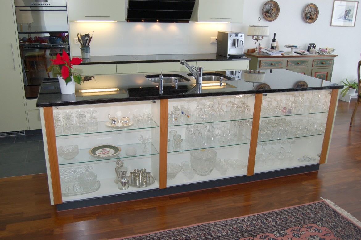 Grosser freistehender Arbeitsbereich mit einseitiger Vitrine, verglast und Rahmen in Kirschbaum Massivholz.