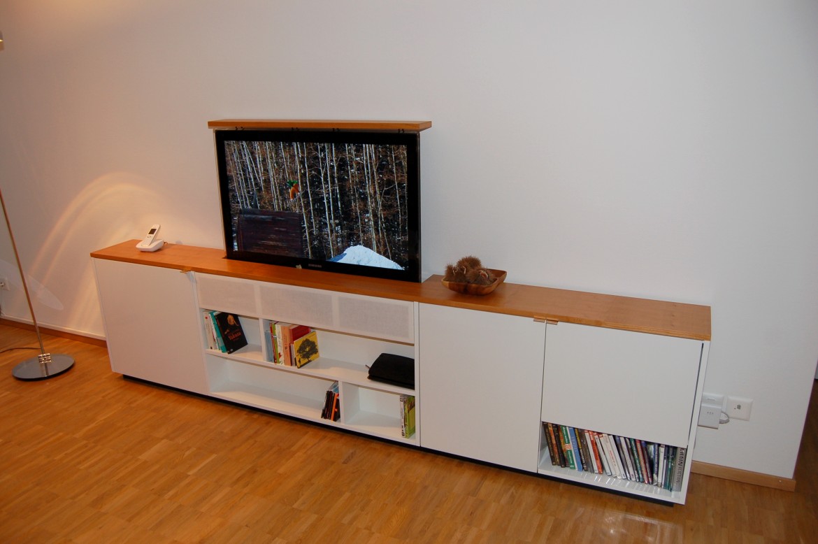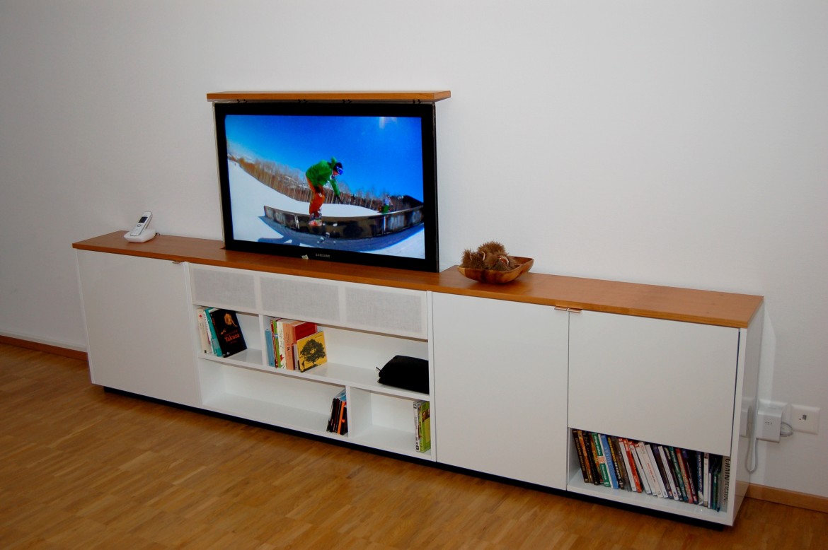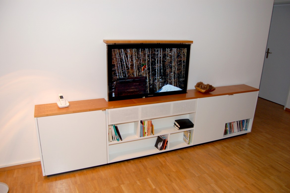 Fernsehmöbel mit voll versenkbarem Bildschirm.