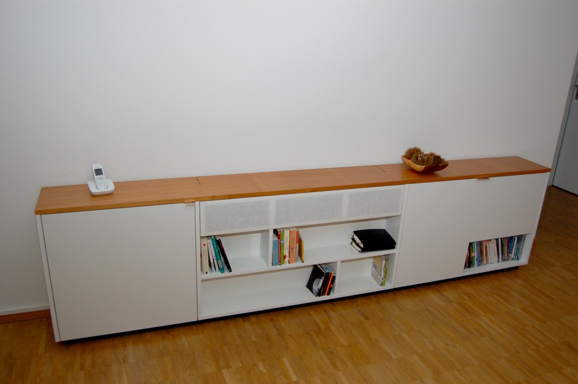 Integrierte Lautsprecher hinter der Stoffverkleidung. Die Hochglanz weisse Acryl Oberfläche lässt sich bei leichten Kratzern polieren.