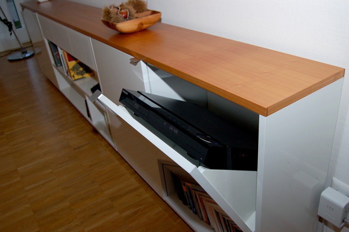 Abdeckung in Kirschbaum furniert und geölt, Korpus in Hochglanz weiss.