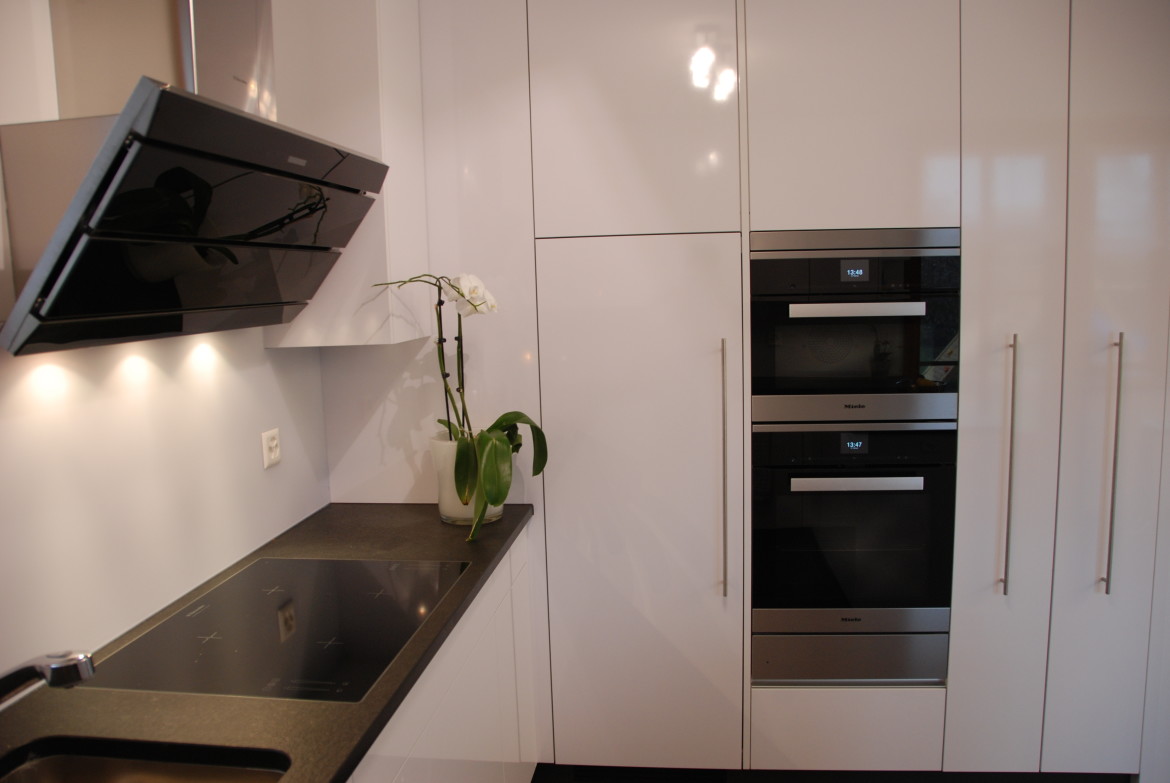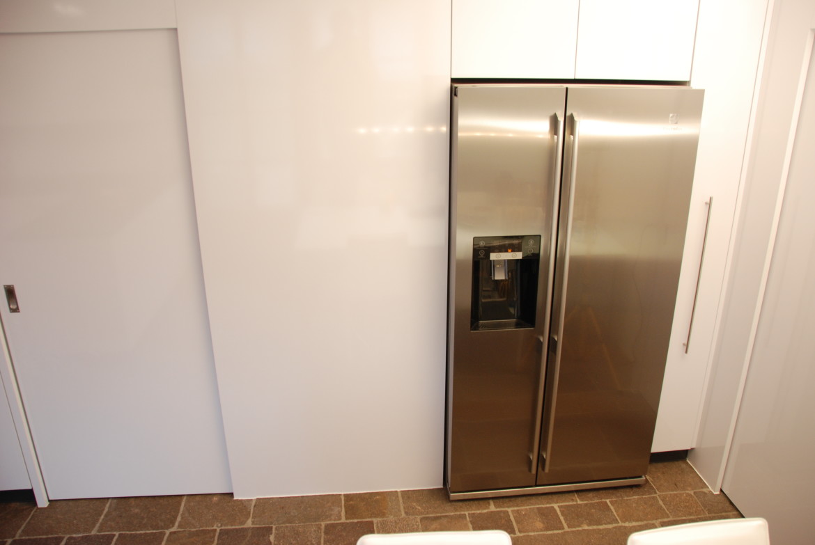 Der grosse Wandbereich mit den Geräten und Schiebetüre, für den Zugang zur Küche, ist auf der Gegenseite gleichzeitig der Eingangsbereich mit Garderobe.