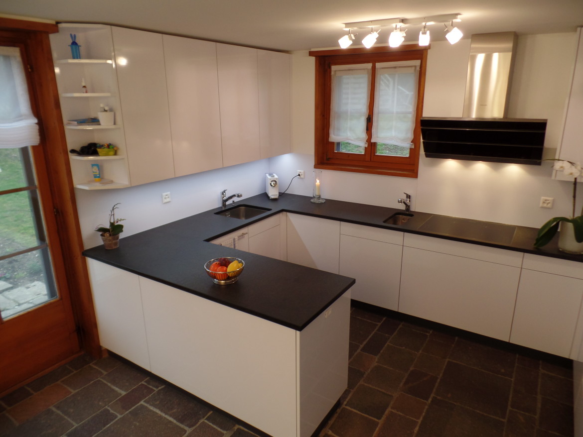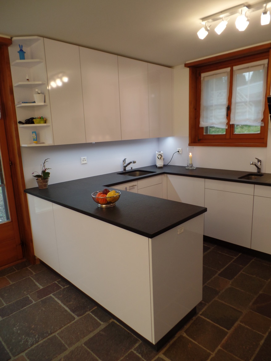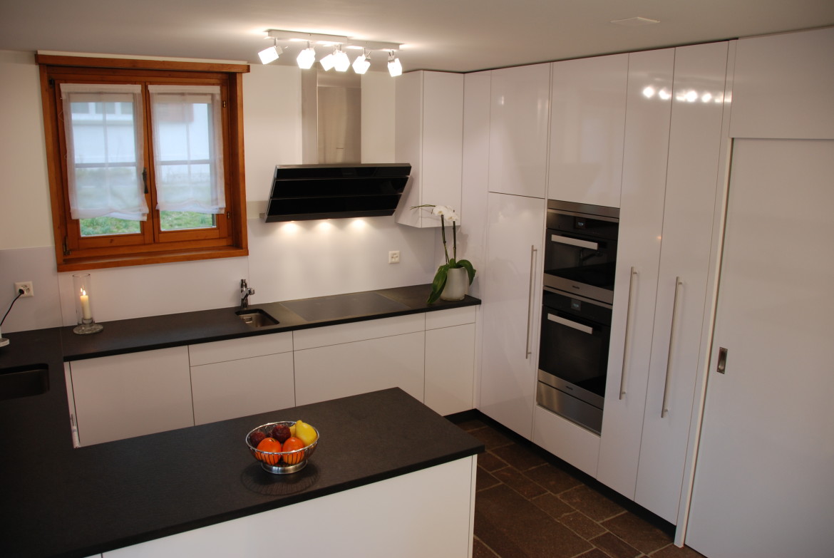 Weisse Hochglanzküche auf Natursteinboden welche nahtlos in den Essbereich übergeht.