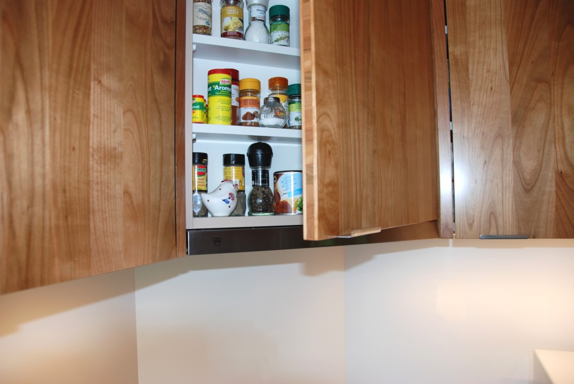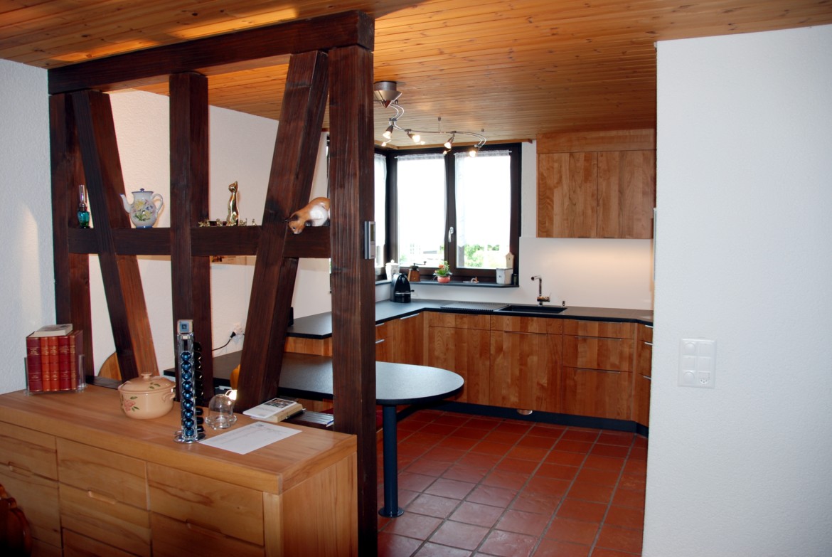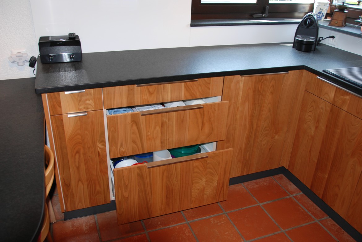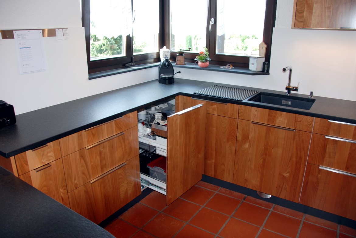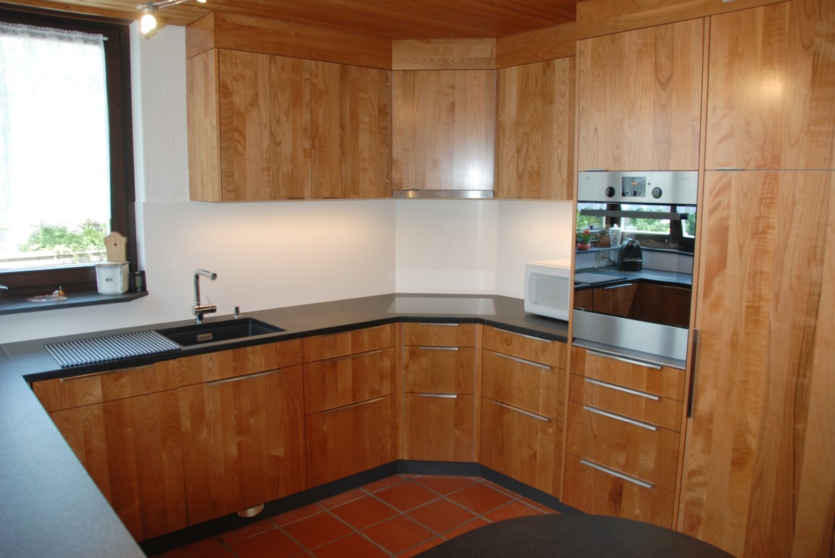 Grosse Küche in einem Einfamilienhaus aus dreischichtigem Kirschbaum Massivholz mit seidenmattem Lacküberzug.